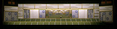 | 誇張された遠近感。錦絵の「浮絵」又は「くぼみ絵」と呼ばれる技法で青畳の一部にもなる。 |