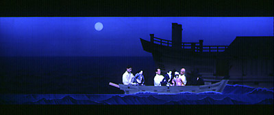 野や山を描いた背景画は「遠見(とおみ)」、対して客席の一番近くにある大道具が「手摺り(てすり)」。 海や川が瞬時に土間、はたまた青畳となる変幻自在の前景だ。 |