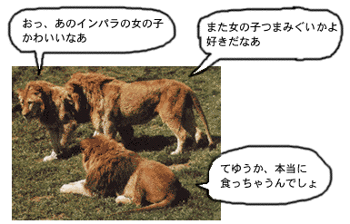 ライオンさんが仲良くよりそってますねー。 のんびりしてますねー。気持ちよさそうですねー。 ライオンさん、どんな話をしてるんですかねブモー。 サバンナの地平線に沈む夕日の話ですかねー。 草原を元気いっぱいに走る子ライオンの話ですかねー。 ライオンさんはとてもメルヘンチックなんですよブモー。 ちょっとライオンさんの話を聞いてみましょうブモー。
