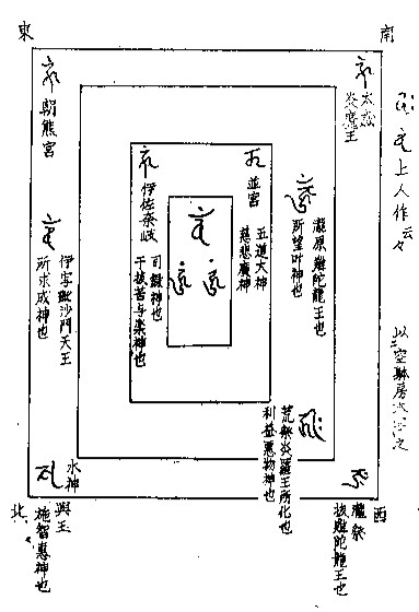 密談云(忠快)或人物語云。 大日如来色界の頂成道す。 南浮提之海中天逆鉾を投下給。 入海之時泡沫凝て成州。 所謂日本国是也。 日本国南州の二中州内遮末羅州也。 倶舎には此州を羅刹婆居矣。 其羅刹婆は伊勢太神宮是也。 私云。大日の垂迹也。 内外宮は因果両部曼荼羅の意也。