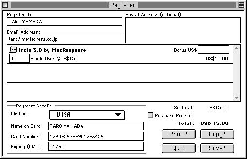- 登録するircleの本数を入れてください、普通は1だと思いますが、複数欲しい人は欲しいだけの本数を記入してください、登録料は1本につき$15(アメリカドル)です。日本円にしてどのくらいかはその時々ですので一概には言えないのですが、15ドルが¥3000を越えることはないと思います(いろいろな手数料込みでも)。