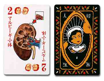 解 説 人体しりとりカード。名前だけを聞くと遊び方を誤解されがちであるが、基本的にはトランプである。4種類の図柄×13枚とジョーカー(に該当するカード)が2枚と他2枚から構成されている。但しスペード・ハート・ダイヤ・クラブの図柄は赤ちゃん・青年・中年・老年に置き換わっている。また各カードは1〜13の数字と共に13種類の人体の部位(解剖図)が描かれている。