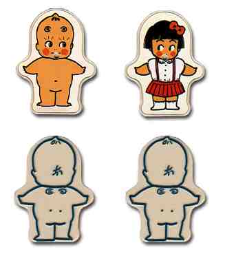 | 解 説 | トランプゲームの神経衰弱とほぼ同じである。但しカードではなく人型の札を使う。人型は「女の子」「お父さん」「キューピー」「変な顔の人」「南極Z号」の5種類の図柄で、目・口・胸・ヘソ・$_儻^\のいずれかに凹凸があり、それぞれの絵柄と凹凸で一組のペアになっている。因みに裏面は全てキューピーの後姿になっている。 トランプの様に数字を揃えるだけであれば比較的にカードの配置を記憶しやすいが、図柄+凹凸の組合せの為か難易度は高い。また、ペアを揃えるだけでなく組合せによって得点(または減点)を設定する応用的な遊び方も紹介されており、単純ながらも知的な工夫が施されている。 作風から既に気づかれている方もいると思うが、このゲームも前に紹介した玄白同様、漫画化のH女史の手によるものである。 |