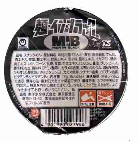 解 説 トミー・リー・ジョーンズとウィル・スミス主演の映画「MEN IN BLACK」の関連商品(と思う)。映画も見たが映画館では売っておらず、ごく普通のスーパーで他のカップラーメンと混じって隠れるように売られていた。大手メーカーの商品にもかかわらず大規模な宣伝も無く、知名度はゼロと言って過言で無い。容器の横に小さく書かれたれた「最高秘密機関MIB公認」という文句がどこか悲しい。