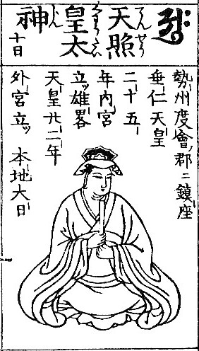 尋上位者、華蔵世界の毘盧舎那仏。 色界の初禅には梵衆天也。 御身長半踰繕那、御寿一中劫なり。索 以来 、大王守護の誓ひ有すか故、照皇天と名く。 故我朝に名て、天照皇太神宮と申す也。 又大日遍照尊と名け奉つる。
