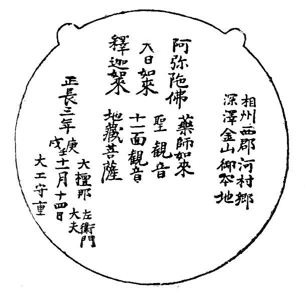 内一は正長三年の銅鏡を神体とす、(径一尺一寸八分)仏像七体並に日月を鋳出せり、 裏に正長三年の銘あり、(按ずるに、正長三年と彫れども、正長は元年のみにして、翌年九月既に永享と改元あれば、今年は永享二年に当れり、全く年号を誤れるなるべし)相州西郡河村郷