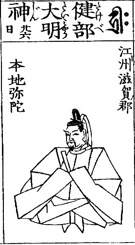 辱も人皇六代、孝安天皇三十四(壬戌)、於当国神崎郡千草嶽天降之神也、 其後景行天皇四十六年(丙辰)四月(庚午)日、 以建部稲依別王命、於同郡建部郷、創建宮殿、依而□神又建部大明神と奉号也