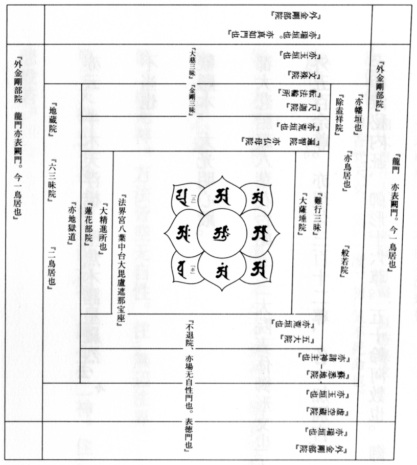 すべては大海の大日如来の印文より起り、内宮・外宮は両部の大日如来である。 天岩戸とは都率天であり、高天原とも云う。 真言の意では、都率天は内証の法界宮殿で、密厳浄土とも云う。 内証の都を出て日本に垂迹する。 故に内宮は胎蔵界の大日如来で、四重曼茶羅を象って囲垣・玉垣・水垣・荒垣と重々めぐらせている。 勝雄木は九本有り、胎蔵界(中台八葉院)の九尊を象る。 外宮は金剛界の大日如来あるいは阿弥陀如来である。 金剛界の五智を象って、月輪は五つ有る。 胎金の両部は陰陽を司り、陰は女、陽は男である。 八人の八女は胎蔵を象る。 五人の神楽男は金剛界の五智を象る。
