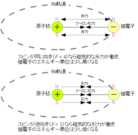 - 価電子と原子核のスピンが逆向き(F = 3)なら磁気的な引力が働き,価電子のエネルギー準位は少し低くなります.