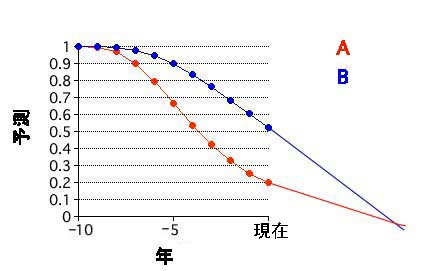 もし図5、6のような様相だったら?。結局AとBの優劣は変わっていない。図4で線を延長したのは希望的観測のなせる技かもしれない。やはり物事は正逆の両面から見ておいた方が良さそうである。