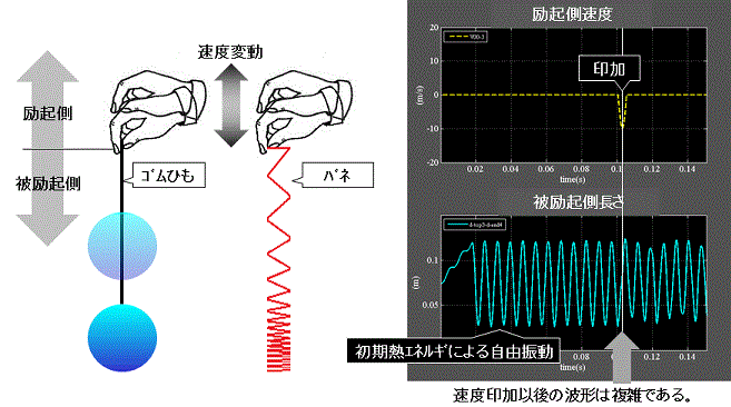 実験は物理機能モデル手法により、粒子と波動の性質を併せ持つ物質を2連のバネとしてモデル化する。