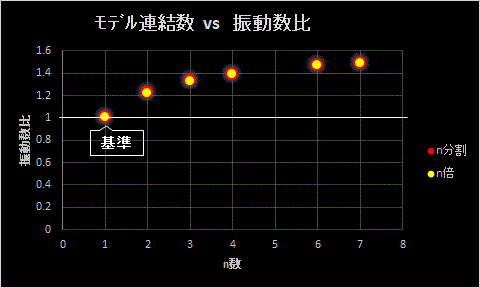 バネをn分割にしても、n個繋げても振動数は固有振動数計算値より高くなる。