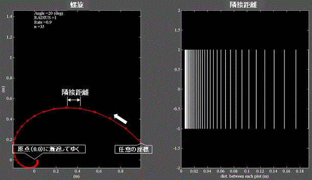 ・左図:XY座標上の任意の点から螺旋を描くと原点(0.0)に漸近してゆく。