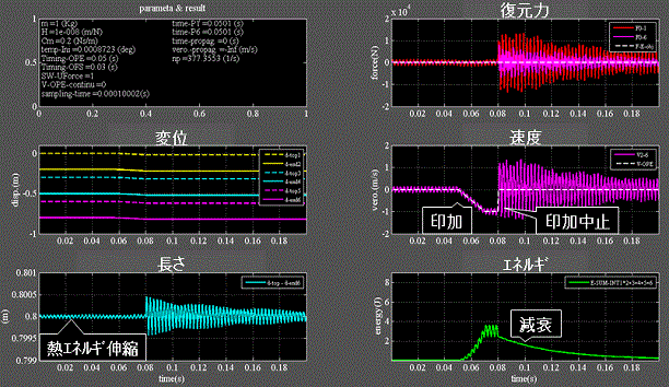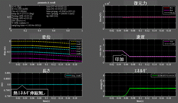 絶対零度では粘性抵抗が発現せず、速度印加を止めるとバネの移動は止まるが、伸縮は続く。