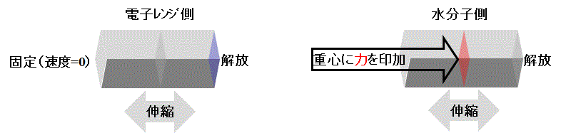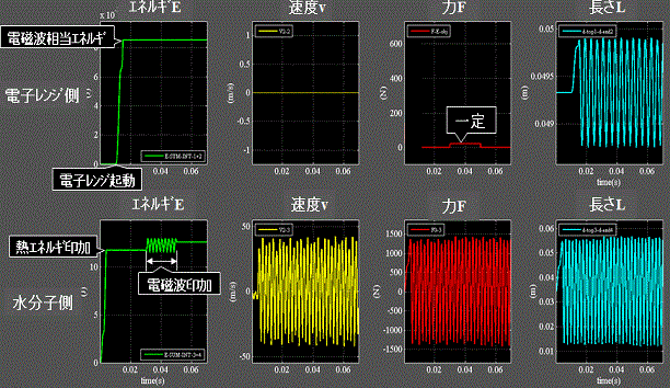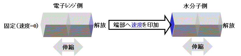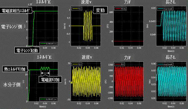 ・2列目上段:電子レンジ側のバネ右端に生じる速度変化を水分子左端に印加する。