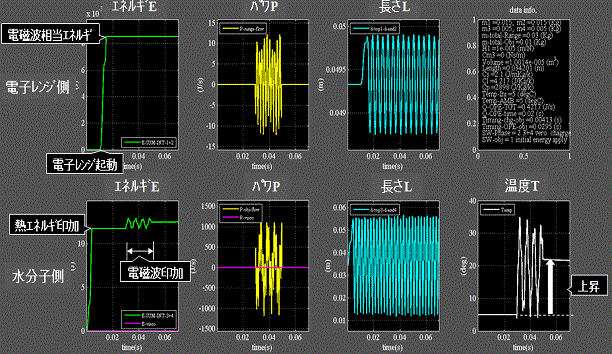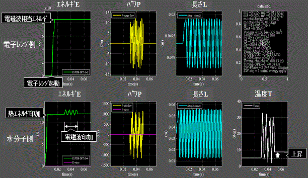 これは前述のように実際の電子レンジの電磁波周波数が2.4GHzであるのに対し、本モデルに於ける固有振動数は電子レンジ側バネ:312.50Hz、水分子質側バネ:142.86Hzと低い為にエネルギ振幅は反比例して大きくなり、差異が拡大されたものと考えられる。