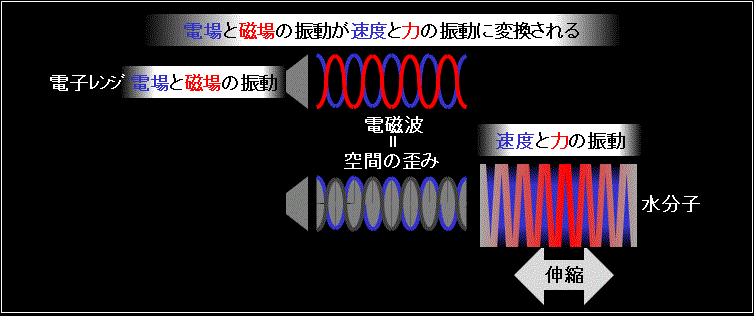 ・電子レンジは電磁波を発生させるが、電磁波は電場と磁場の振動による空間の歪みの伝播である。