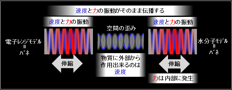 この力fを電子レンジ側バネに印加するとバネは伸縮を初め、その端部の速度変化が電磁波による周期的な電場=空間の歪みに相当する。