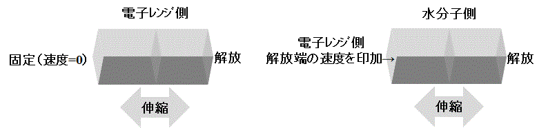 同様に水分子を実体のあるバネに置き換えると、空間に隣接する端部は空間の伸縮による速度変化を受けて力=復元力が発生し、伸縮を始める。