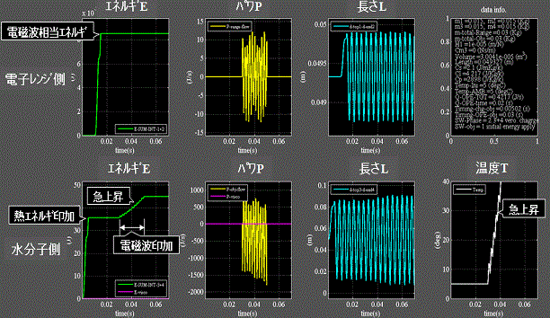 電子レンジ側のバネの伸縮から実体の無い空間の歪みが生じ、それが伝播して隣接する水分子側バネを伸縮=励起させる現象を模擬出来た。
