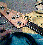 いよいよ弦を張ります。ベースの場合,テンションが高いのでネックのよじれを最小限に抑えるため高音弦・低音弦を交互に張っていった方がよいそうです。6弦ベースの場合は特にそうですね。弦をブリッジの穴から通し,先端をペグのポストの中心の穴に差し込み数回手でポストに巻き付けます。このとき,弦は必ずポストの上から下に向かって巻き付けましょう。手で巻けなくなったら,ペグを回して右手で弦にテンションをかけながらきつく巻いていきます。 |