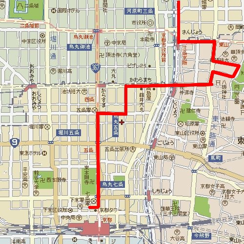 1030東本願寺→(移動15分)→1045二条城(移動軌跡)
