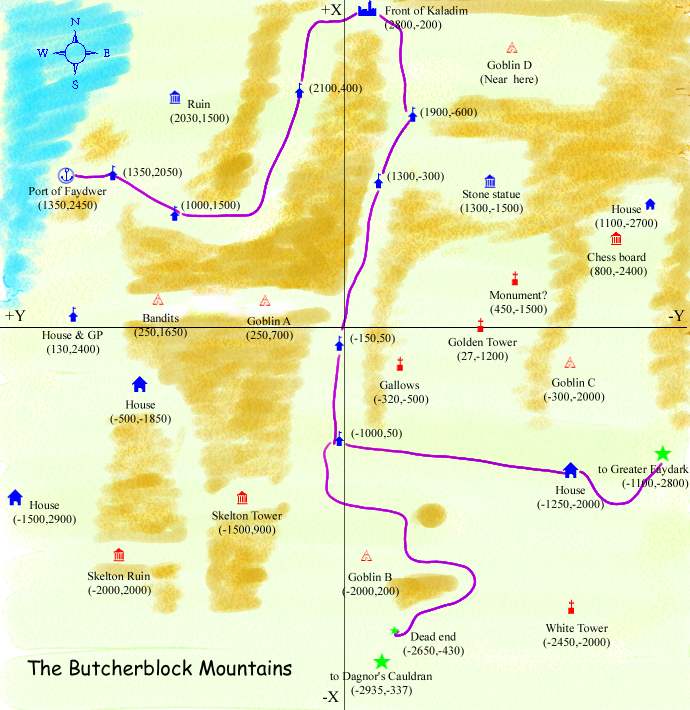 (-1000,50)は有名な三叉路です。ここの南にはゴブリンキャンプがあり、不利になったらガードポストに逃げこむことで経験を稼ぐことが可能です。南に進む道はUnrestを含む地域であるDagnors