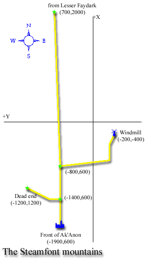 LesserFaydarkを抜けると明るく見晴らしの良い土地に出ます。木は少なめで、山があり所々蒸気が吹き出しているのが確認できます。