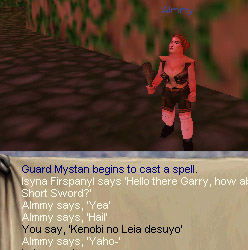 Leiaでloginすると、そこは三叉路のガードポストの中でした。食べ物が2つある状態です。水を魔法で作ってから、さっそく狩りを開始。頑張ってLv7を目指さないとね。現在 6と3/4バブルだけ。通りすがりの青く見えるゴブリンや、白いスケルトンナイトを相手に戦います。Alqueenさんという人が、Healしてくれと言って来たのでLight Healingを2発かけました。どうもこの名前には見覚えがあるので、are you japanese?と問い合わせるとyesとのこと。
