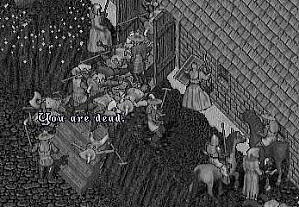 脇のゲートはエルフ用。1名くぐったら中に殺人者のエルフが出現してゲートを塞ぐ。ゲートを使って回復したければ、このNPCのエルフを倒す必要がある。瀕死のキャラでかなうわけもなく、死体の山。しかし、幽霊になるとゲートに入れるのでこの嫌がらせキャラは意味があまり無い。