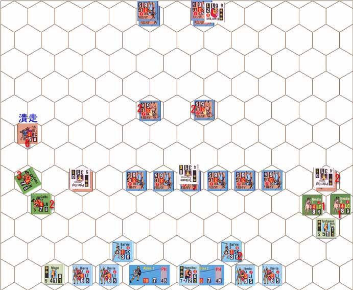 軽装歩兵1番はコホルトと潰走するローマ騎兵を攻撃する。ローマ騎兵はTQチェックに失敗して(潰走中のユニットのTQは1に低下する)除去される。側面攻撃のため攻撃側の優越のため、コホルトは6ヒットを食らって潰走し、軽装歩兵は2ヒット加算して合計4ヒットになる。敵がいたへクスへと進み、残るコホルトを拘束することに成功した。