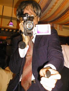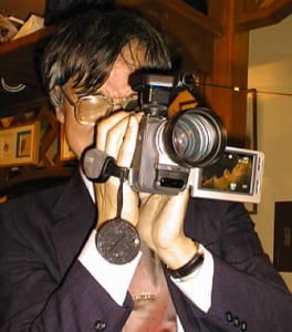 スタンダードなビデオの撮影方法であるといえる。 液晶部分を撮影する相手に見えるようにすることがポイントである。 (写真では、撮影されている森本の姿が見て取れる。) 通常の風景、人間を撮影するときに有効。 |