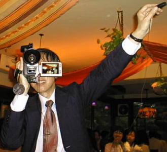 右手でカメラを固定し、左手でマイクを持つ。マイクはできるだけ撮影対象 に近づける。できるだけ至近距離から取る事。撮影対象の人間がびっくり する事もあるが、気にしてはいけない。この写真には写っていないが、腰を しっかり落として固定する事。 このような体勢になる。