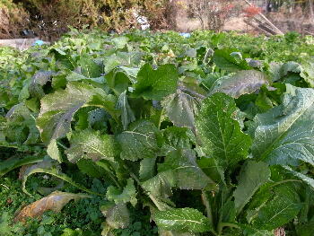 国道143号線から県道181号(保福寺街道)に。 道路わきの畑には、特産品の野沢菜が育っていました。