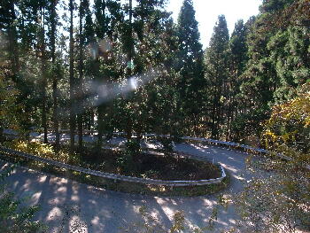 林道は道幅も狭い上、ヘアピンカーブでは濡れ落ち葉にタイヤが取られてスリップするので、ブレーキを握り締めて