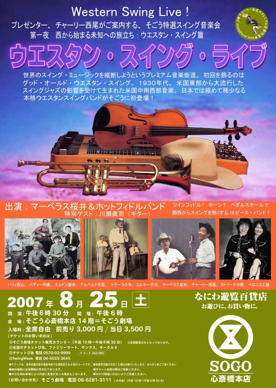 HFB初の「レコード」の発売が間近に迫ってきました。 なんとCDではなくアナログのレコードなのです。 チャーリー西尾が音頭を取って、レコード発売記念ライブを心斎橋そごう劇場で ぶっ放します。 2007 08 / 25 (Sat) Open 6:00pm Start 6:30pm 前売 3,000円 当日 3,500円 チケットピアで好評発売しておりましたが、早くも一旦Sold Out! しかし、好評につき追加発売が始まりました。 チケットぴあの他に ファミマ ・ サンクス ・ サークルK とかでも買えるようですよ。 お問い合わせは Swing Week TEL : 06-6533-3645 または Hally まで! そごう劇場 TEL 06-6281-3111 〒542-8555 大阪市中央区心斎橋筋1丁目8番3号 ![]() (そごう劇場のサイトより転載させていただきました) |