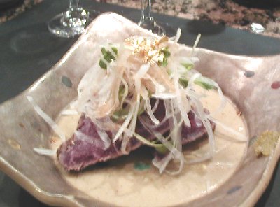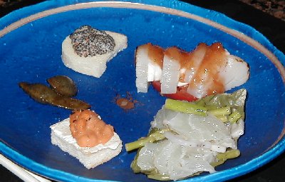 黒豆の枝豆、 トマトのスライスの上に貝柱とモッツァレラの梅肉ソース、 スィートバジルの大きな葉の上に鯛のカルパッチョ。 もう一つが思い出せません。 |