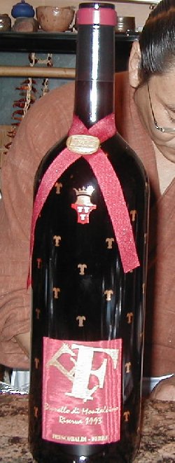 1993 赤 1500ml (通常の倍の量) 世界で2万本限定、日本には1千本割り当てがあって、その2本を キノシタさんがゲット! フレスコバルディ社のワインは私にとって馴染みが深く、イタリアワインを 知る切っ掛けを作ってくれた銘柄です。 神戸にあるワイン輸入業者フードライナーで教えてもらったのが最初で、 ペンション・リミニにもお勧めして、ここのワインを置かしてもらってます。 ところが、今年4月から輸入業者がメルシャンに変わってしまいました。 サンジョベーゼ種の赤ワインの特徴は、抜栓直後の強い酸味と、半時間置いた後 の程よい渋味、その味の変化が印象的なことで、 食事の最初、前菜にはまだ渋味の少ない味が合い、半時間ほど経って、メインの 肉料理に差し掛かる頃には、重厚な渋味が出てくる。 これがディナーにマッチするので、私の一番の好みな訳です。 このダブルサイズのワインを入れた箱があり、黒塗りの重厚な木箱なのですが、 試飲会恒例の抽選会があり、当たった客にプレゼントされました。 残念ながら人の手に渡ってしまいました。(自分のワインみたいな言い方ですな) |