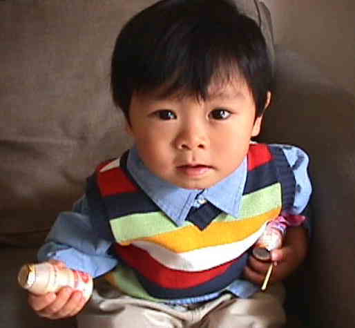 2000.11. 息子はこの夏2歳のお誕生日を迎えました。おしゃべりも結構するようになり、お互いに言う事が分かるようになってきました。 行動も赤ちゃんから子供になってきた感じがします。「もってっても?(いい?)」などと言ってわたしの外出用のバッグにいろいろ詰めたりします。お気に入りのぬいぐるみ、本、ヤクルトなど・・・。 黙っているとどんどん荷物が大きくなっていくので、どれかを諦めさせるのですが・・・結構大変で、出かけるたびに大騒ぎです。 歌が好きでビデオやCDにあわせて歌ったりします。「おすむび、おすむび、ちょと、つめてぇ〜♪」まだはっきりとおしゃべりが出来るわけではないので、言葉は今が一番面白いかなぁ〜と思います。 運動神経はいいような気がします。ジャングルジムをサルのように素早く駆け登ったりします。お風呂上りに裸でジャングルジムに登っている写真を掲載しようと思ったんですけど・・・将来うらまれるかなぁ〜と思い、少しおすましした顔を載せました。 |