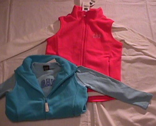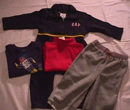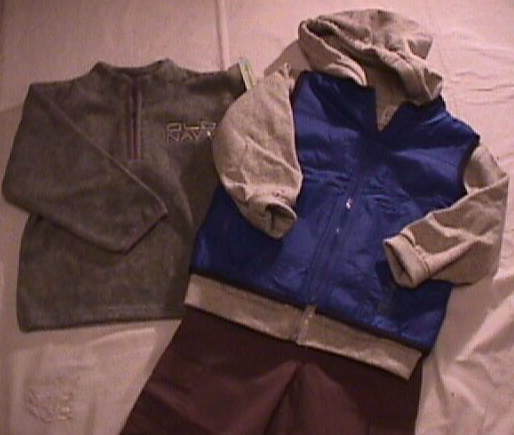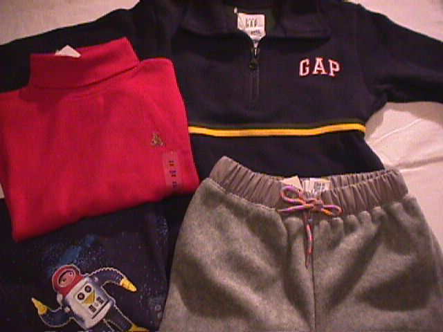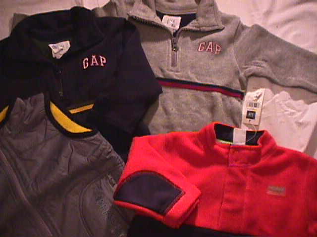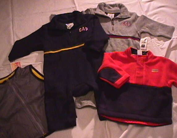 | 長袖のつなぎが2枚(紺とグレー)、フリースプルオーバー、オールドネイビーリバーシブルベスト(グレー裏がイエロー) 以上4点 | |