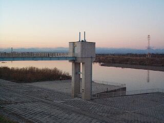 せん。車を降り、利根川のほうを見ると、小さな搭が見え、その下に小さな水門がありました。どうやら,ここが分岐点のようです。