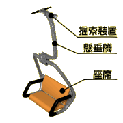 自動循環式の搬器は握索装置と牽引ロッドで構成され、ロッドの端が体を支える