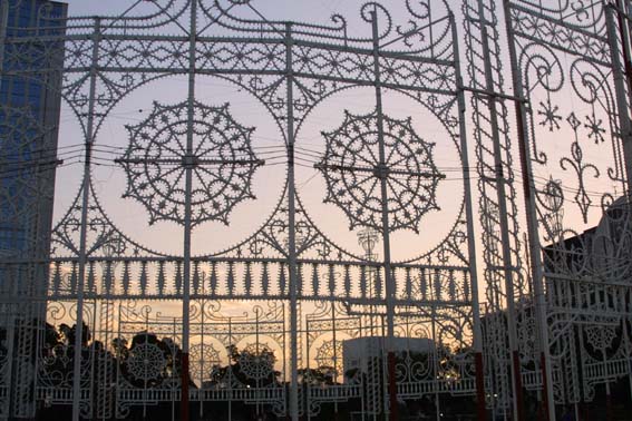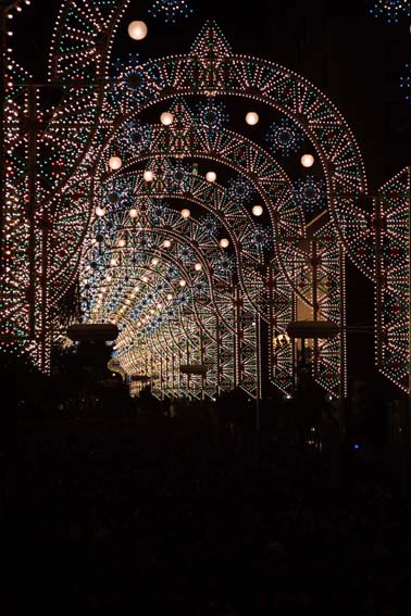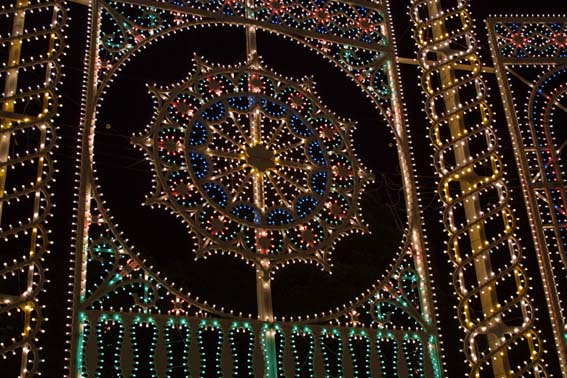 今年のルミナリエは、最後の公園の所で円状に作られたのが見所(?)らしく、ライトアップされて 中に入ると圧巻の一言でした。因みに右の写真は、夕方まだ明るい内に撮ったものです。 全部は入り切れてないけど、なんとなく雰囲気は掴めるとは……思うんだけどね。 D30での夜景は補助光が全くと言って良いほど使い物にならなくて(清水寺の夜間拝観で 実証済み)色々不安材料が一杯だったんだけど、その心配もなんのそので「明るい」の一言で その心配は、心配だけで済み(って言うか、発光体撮ってるんだからピント合って当たり前) ちなみに、この白い奴(正式名称知らない(汗))は木で出来ていてそれ ↑夕方の景色。夜も更けるとこの中でカップルで溢れる に電球を付けてあるだけの物としてはシンプルなんだけど、でも並べ方 とかラジオで言ってた。カップルは中で何を願う… 一つでこんなに綺麗に出来るって言うのは凄いなって思いますね。 今年は、このルミナリエ以外でも同じ様な事をしてる所が多くてテレビで何箇所か紹介されてました。 やっぱり灯り物って言うのは、何か寄せ付ける不思議な物が有るんでしょうね。 しかし、人が多い事多い事。右の写真は下の方をカットしてありますが、してなければ人の頭・顔・顔 、ん〜〜〜〜明るいので……。 まぁ其の中の一人を演じながら、写真を撮りつつ帰ってきたのでした。 後は、皆さんカメラ持ってる人が多い事、写るんですから一眼レフまで。それぞれが至る所で写真を撮るものだから いつの間にか写真撮るのを邪魔してたり、されたりとある意味、無法地帯化してた ↑ 点灯すればこんな感じ。間近に見ると圧倒されて のですが、やはりオバちゃんは強いし怖かった。なんせ「口を出さず 暫くここに居ると別世界に居る気分になります。 に肘を出す」……怖い。まだ「にーちゃんどいてや」って言われる方が 何ぼマシかって思えます。あーこわ。 因みに、上の写真を大きく撮ってみたらこんな感じです。木で作った枠に電球を付けてるって感じですね 人手と時間がかなり掛けられたんだろうなって痛感させられます。所で、これ終わった後は、どの様に 保管されてるんでしょう?電球なんて割れやすいし、片付ける時には外してるんだろうか?枠は? とか、今更ながらこれを書いてて疑問に思いました。 ルミナリエのもう一つの見所(?)通り抜けの所です。すし詰め状態で移動しなければいけないので 私はここを通った事がありま ↑一つ一つ定間隔で並べてあります。この写真では分かり難い せん。2回とも公園側から見て ですが、実は色ずれが発生してます、レンズの所為かな? 満足って感じですが、しかしこれを撮る為には、恐怖のおばちゃん達をパスする必要があったりとか ちょっとした修羅場だったりします。 まぁ なんとか無事に写真撮って帰ってきたのでした。