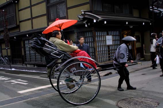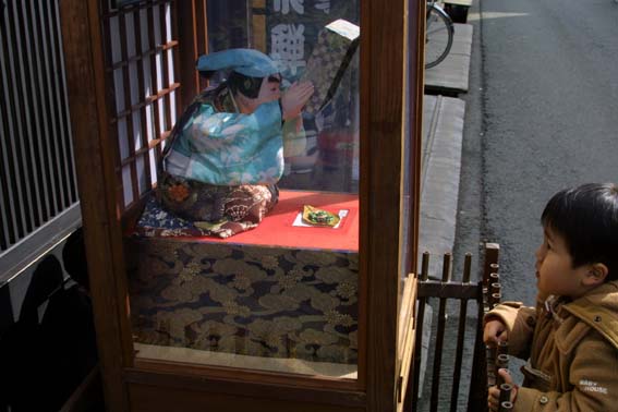福地温泉を後にして、混みまくりのバスに乗って高山へ。 昨日とはうって変わっての曇り空だけど日曜と言う事も有り人が多い事。 この高山には、朝市とか古い町並みとかからくり人形だとかなんか色々有るらしく 昼前から夕方まで丸々堪能させてもらいました。(って言うか電車が夕方しか無かった と言う話も) 右の写真にも写ってますが人力車ですよ人力車。観光名所には必ず有りと言われたりね(?)結構 もてるらしいんですよこれ引いてる人(どーでも良い話ですがね) ほんとは正面から撮りたかったんだけど これ写ってた人がアレで→ コレもんでばれて大騒ぎになったらいけないと(笑)思って横から撮りました。 EF28-135IS使用 この二日間天気が崩れる事も無く良かったのですがこーいう所を見るとやっぱり 雪降る所だねぇと痛感します。道路の方は隅に寄せられてるので汚い雪しか無いのですが 人が余り入らない所は綺麗です。そう言えば、途中でクレープ屋を見つけたのですが そこには「焼肉クレープ」とか「漬物クレープ」とか普段食べ無い私にとっては目から鱗が落ちる 思いをしてとりあえず食べてみたのですが(漬物は売り切れで焼肉が有ったので焼肉にした)… 一口食べて、とりあえず無かった事にしてもう一人に上げちゃいました。やっぱり焼肉は単体か ご飯と食べるのが良いです。 だってさ凄く甘いんだもん……温かいし…貴重な体験ありがとう ↑しかし、見た目は綺麗でも降ってから結構時間が経ってるみたいで 硬そうな雪です。 旅行仲間にさっさとしろって怒られつつも橋の上から。 EF28-135 IS使用。 で、さらに町並みを散策してるとわらわらと出て来るのが「さるぼぼ」大きいのから小さいのまで 色々吊るされてます。そんなのを横目に歩いてると子供が熱心に見入ってる物が有ったのでそれを 見てみると……からくり人形ですねお人形さんが箱を開けるとあら不思議、色んな食べ物が 出てくる不思議な箱。ちなみにこれは朴葉味噌。このお子様必死で食いついて見てました。 玉手箱みたいで楽しみなんでしょうねぇ〜うんうん からくり人形を近くで見たのってそんなに無かったので面白かったよ→ この子ほんとに食い入って見てて……いやぁ子供って良いね〜 EF28-135IS使用 ←で、これが動力源。水が少ない時は動かないらしい EF28-135 IS使用 さっきのからくり人形に影響をうけ調べたら近くにからくり人形を動かしてる所が有ると言うことで 見に行ってきました。牛若丸が階段を上ったりとか色々人形が動いてびっくりしたり 般若の作り方が書いて有ったりとかで一日潰して夜に京都に帰って来たのでした。 これは後ろから多数の紐で操作するタイプだそうで凄く器用に→ 動いてた。これ以外にはお茶運び人形とか有り、こんなのが江戸時代には有ったって言うんだから 凄いなって関心しましたよ はい EF28-135IS使用 |