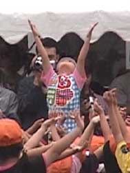 | 遊戯 それに比べて、年長になると、いろんな形を作って、 いろんなところに移動しながら踊ります。 これは、楽しそうに踊っていました。 後半では、年長の恒例・バルーンをやります→ うまく膨らんで、客席からも、 「お〜」と言う声が出ました。 |