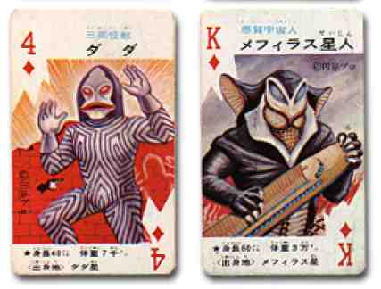 | 解 説 | 草むらで のどかに火を吐く エレキング と、一句詠いたくなる様な穏やかな光景が描かれているこの箱は、冷蔵庫用防臭剤にオマケで付いていたトランプである。 このトランプが配られた当時は一大怪獣ブームの時代。他にも多くの怪獣商品があり、中でもブロマイドは安さ故に子供達に絶大な支持を得ていた。カラー写真で怪獣を見慣れている子供達の目は当然厳しく、紙芝居を思わせるような粗いタッチで描かれたこのトランプは残念ながら敬遠されがちであった。 カードには1枚ずつ異なる怪獣が描かれており、その殆どはウルトラQ・ウルトラマン等に出演した怪獣である。が、何枚かブロントザウルス等の恐竜が数枚混じっている。怪獣ファンの子供達にとっては完全な「まがい物」であるが、実は絵そのものは修作ぞろいでなかなか味わい深い作品集と言える。 ここでは全てを紹介できないが希望が多ければ企画展示館で個展を開く予定である。 |