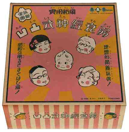 | 解 説 | トランプゲームの神経衰弱とほぼ同じである。但しカードではなく人型の札を使う。人型は「女の子」「お父さん」「キューピー」「変な顔の人」「南極Z号」の5種類の図柄で、目・口・胸・ヘソ・$_儻^\のいずれかに凹凸があり、それぞれの絵柄と凹凸で一組のペアになっている。因みに裏面は全てキューピーの後姿になっている。 トランプの様に数字を揃えるだけであれば比較的にカードの配置を記憶しやすいが、図柄+凹凸の組合せの為か難易度は高い。また、ペアを揃えるだけでなく組合せによって得点(または減点)を設定する応用的な遊び方も紹介されており、単純ながらも知的な工夫が施されている。 作風から既に気づかれている方もいると思うが、このゲームも前に紹介した玄白同様、漫画化のH女史の手によるものである。 |