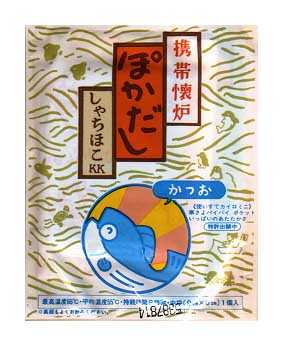 | 解 説 | 「かつおだし」と「携帯懐炉」を何とかして結び付けたかったのだろうか。随所に努力の跡が伺える。背景に書かれた釣り人やペンギン、中央に描かれた魚と「かつお」と書かれた吹き出し、そして「シャチホコKK」という架空の会社名・・・(因みに裏面に書かれた社名は全く違う名前である)。 携帯懐炉の機能や性能を詳しく知っているわけではないので一概には言えないが、製品そのもは携帯懐炉として充分機能していると思う。が、小さく書かれた「特許出願中」の文字が気になる。一体何の特許であろうか? 携帯懐炉を最初に開発した会社なのかも知れないが、それなら今頃出願というのも妙だ。もしや「だし」と「懐炉」の融合の特許なのか。 |