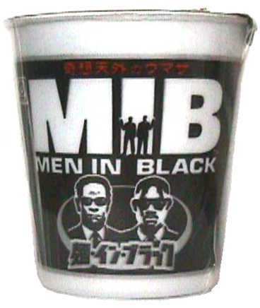 | 解 説 | トミー・リー・ジョーンズとウィル・スミス主演の映画「MEN IN BLACK」の関連商品(と思う)。映画も見たが映画館では売っておらず、ごく普通のスーパーで他のカップラーメンと混じって隠れるように売られていた。大手メーカーの商品にもかかわらず大規模な宣伝も無く、知名度はゼロと言って過言で無い。容器の横に小さく書かれたれた「最高秘密機関MIB公認」という文句がどこか悲しい。 奇想天外のウマサらしいが、例によって食べてはいない。材料は一般的なカップラーメンとほぼ同じだが、「イカスミ」「カカオ色素」などが使われているので、真っ黒いスープに麺が浮かぶ、そんな出来上がりの図が予想される。麺・イン・ブラック、きっとそのまんまであろう。 |